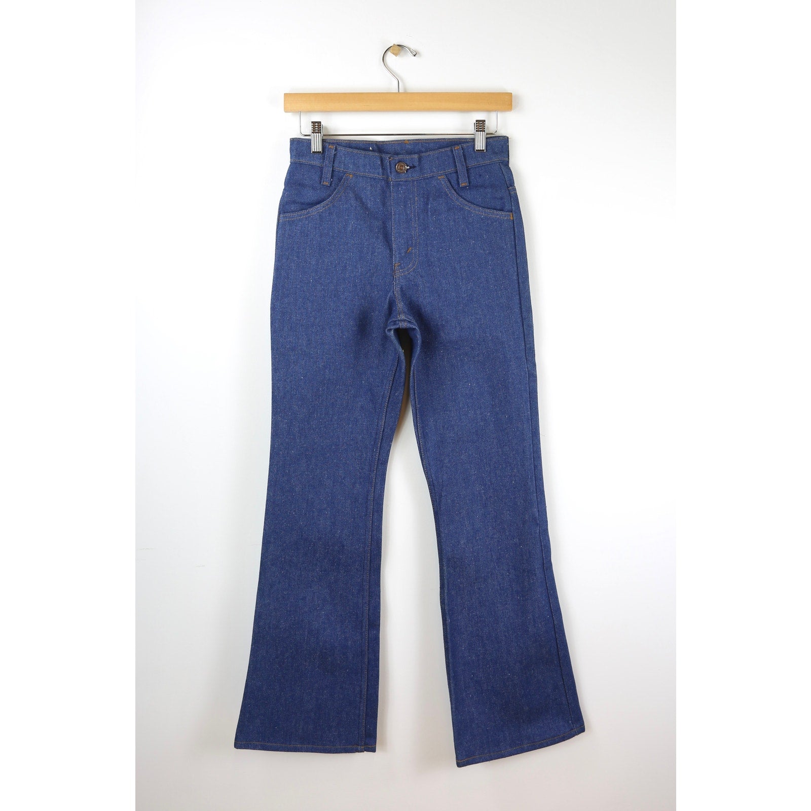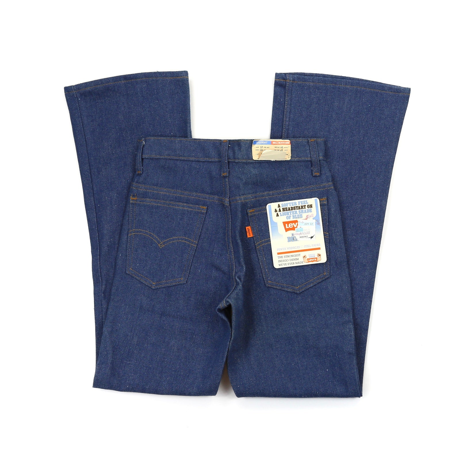 Vintage Levi’s 1980s Deadstock Bell Bottom Jeans. These absolutely amazing student fit Levi’s are an amazing deadstock find! These beautiful dark wash jeans have a classic Levi’s bright orange stitching along with a mid rise fit and a bell bottom flare. Made from 100% cotton, made in the USA and in great deadstock condition 10/10 with no signs of wear. Tag reads size W27 L 29 but please compare to measurements below for the best fit! Due to rise these may best fit a 25-26 in high rise measurements.