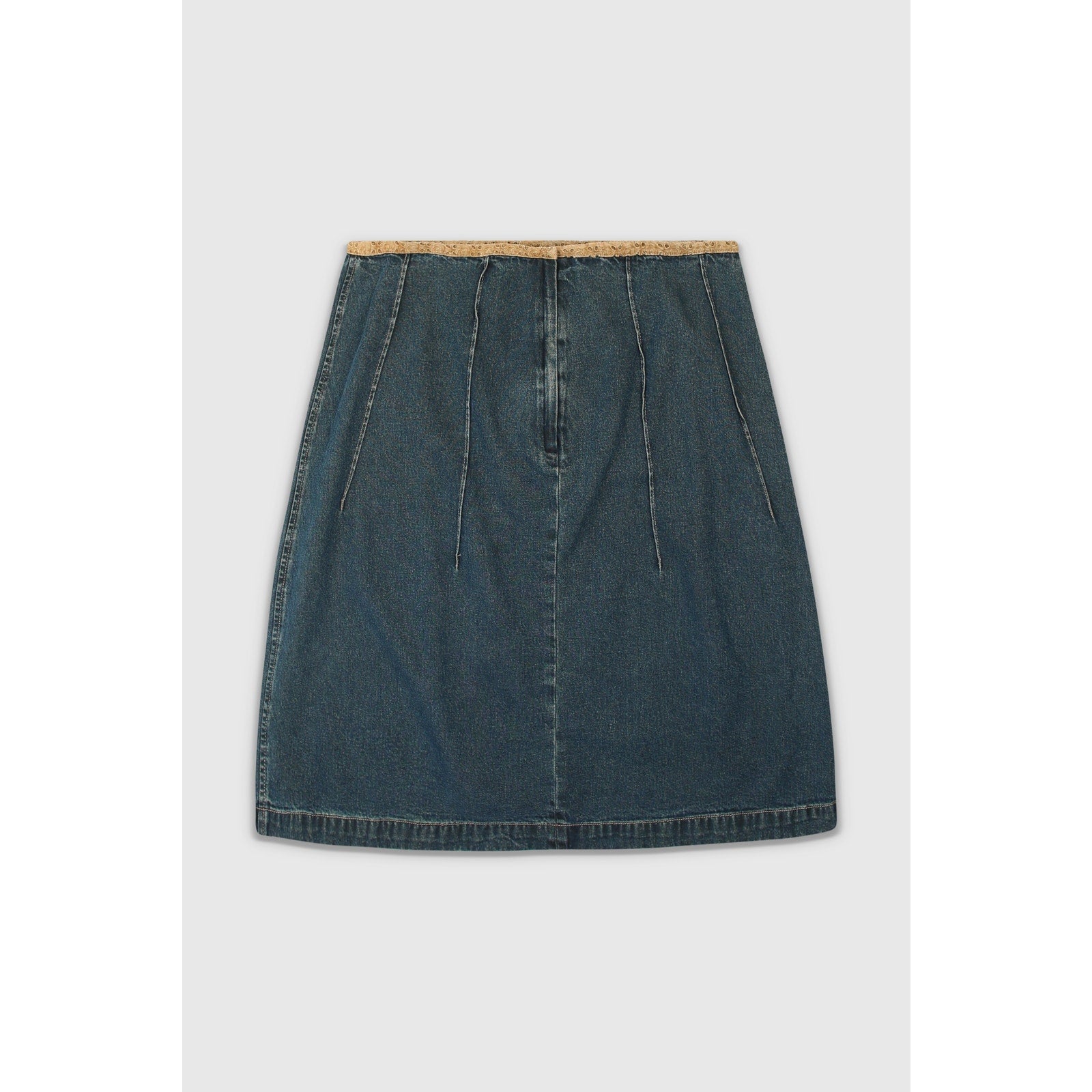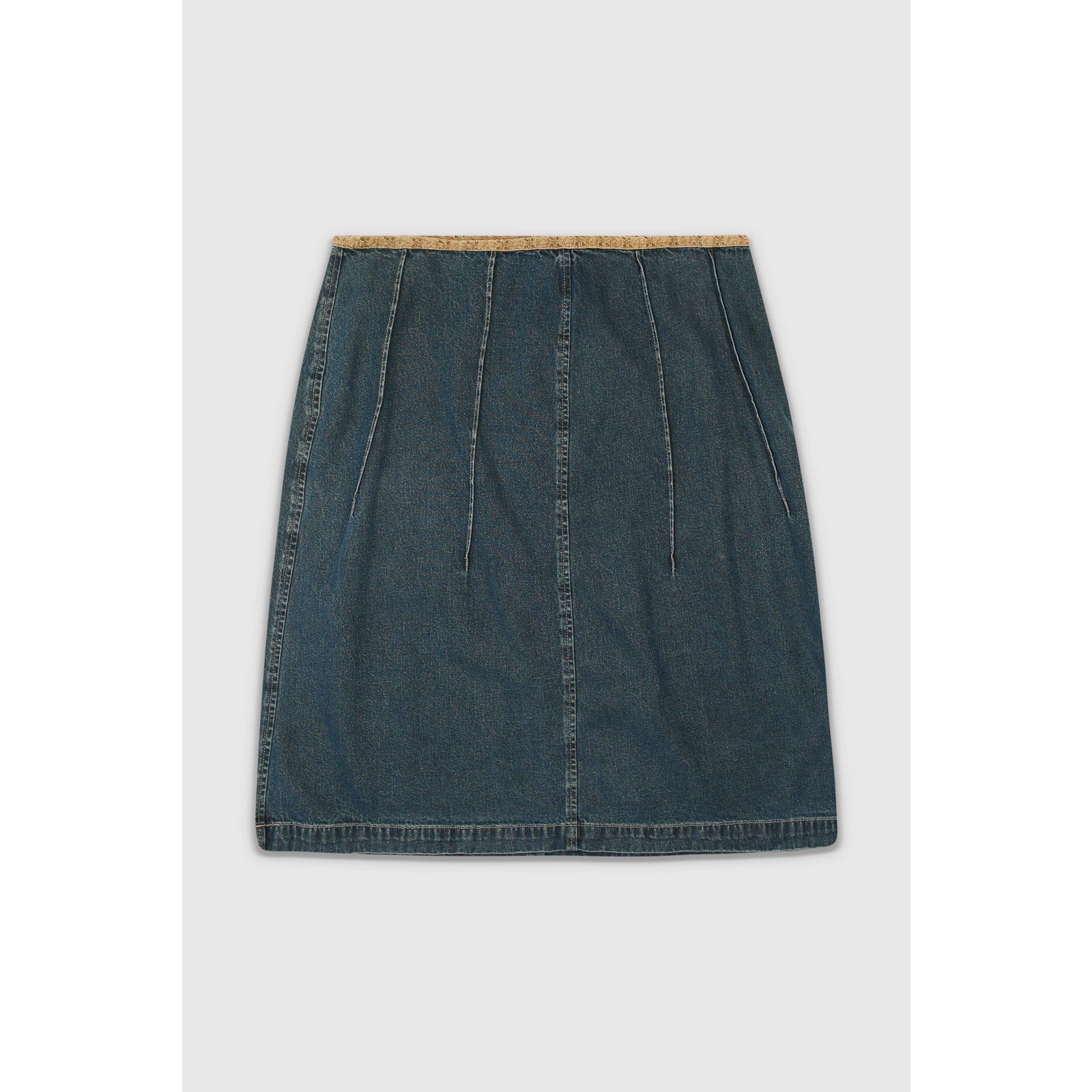 Vintage 90s Denim Midi Skirt. This dark wash denim skirt features a paneled construction, subtle natural fading, and a unique textured waistband with slight gathered detailing. The simple A-line silhouette gives it a clean, structured look. Made from 100% cotton denim and in great vintage condition 8/10 with some light wear as seen in photos. Tag reads vintage size 12, but please compare to measurements below for the best fit!