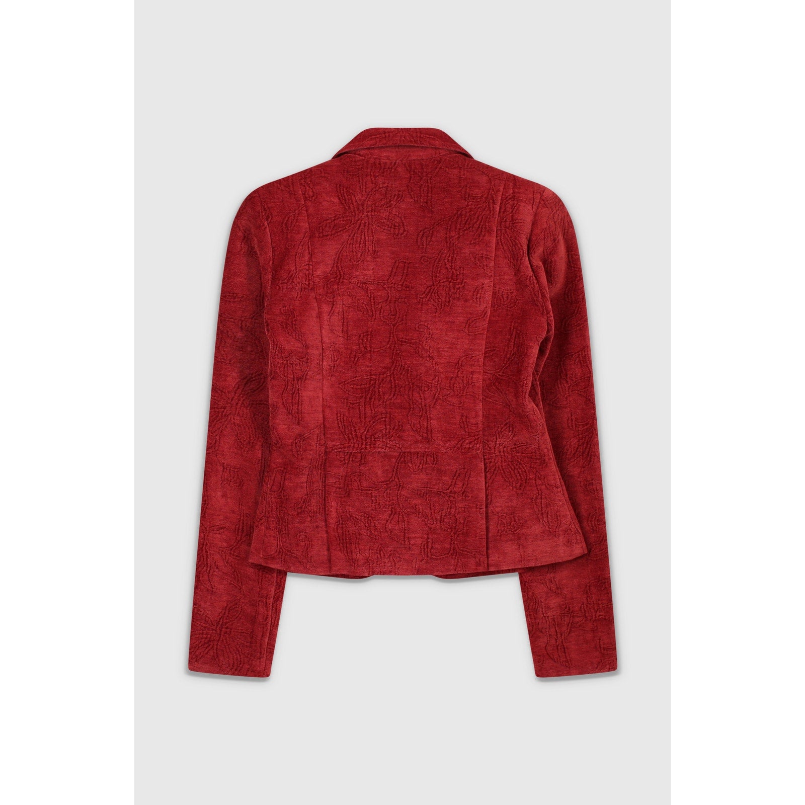 Vintage 90s Textured Red Blazer. This vibrant red blazer features a sculpted notched collar, covered button front, and a beautifully textured velour-like fabric with subtle abstract patterning throughout. The tailored cut, curved hem, and decorative front pockets give it a polished, feminine silhouette that channels classic 90s statement style. Made from 65% rayon 35% polyester and in great vintage condition 8/10 with some light wear as seen in photos. Tag reads vintage size M, but please compare to measurements below for the best fit!